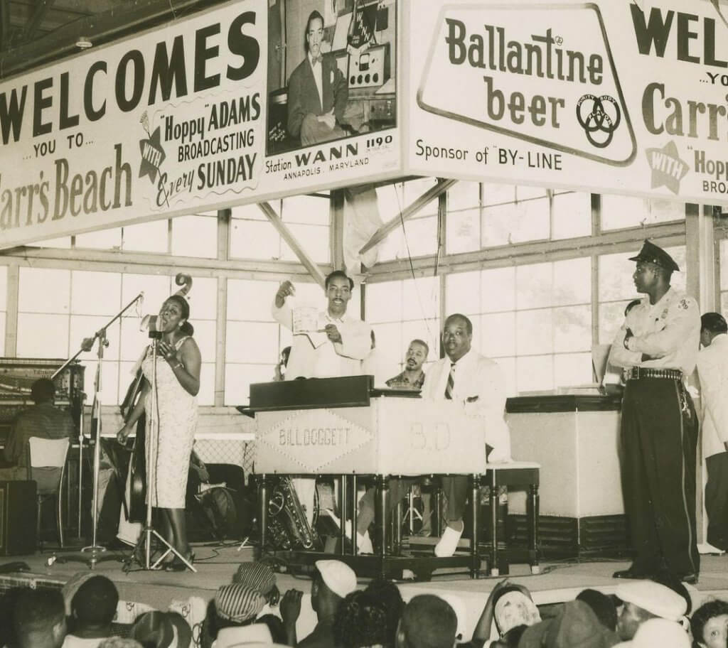 There was more good music on WANN, 1190 AM, from Annapolis. I remember two disc jockeys, Theron Pinkney and Charles “Hoppy” Adams. Both played a good mix of current rhythm and blues, but it was Hoppy who made the bigger impact on me, first of all with his two theme songs: Sil Austin’s “Wildwood,” a strutting, honking tenor sax feature, and Sonny Terry’s “Hootin’ the Blues,” which was my introduction to one of the great blues harmonica players. (There are links to the tunes at the end of this article.) Hoppy played a fair amount of down-home blues – I think I first heard Howlin’ Wolf and John Lee Hooker on his show – along with the then-current R&B hits. Pinkney, for his part, went on from WANN to become the first Black play-by-play announcer on a major TV network, ABC.
