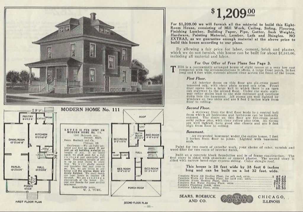 Mail-order house kits were a solution for many people. The kits were available in many styles and at a range of price points. The foursquare was a popular variety offered by Sears, Roebuck and Co. and Aladdin, the two biggest kit house manufacturers. In the early 20th Century tens of thousands of these “catalog houses” were sold. Kits of pre-cut and labeled parts and directions were delivered in a railroad boxcar; kit houses proliferated in towns with rail lines. Sears offered three lines of homes in hundreds of styles, aimed at customers’ differing financial means. The popular Woodland model was a foursquare, and was sold for $938 in 1916.