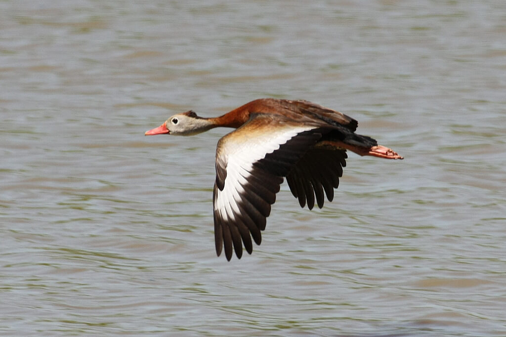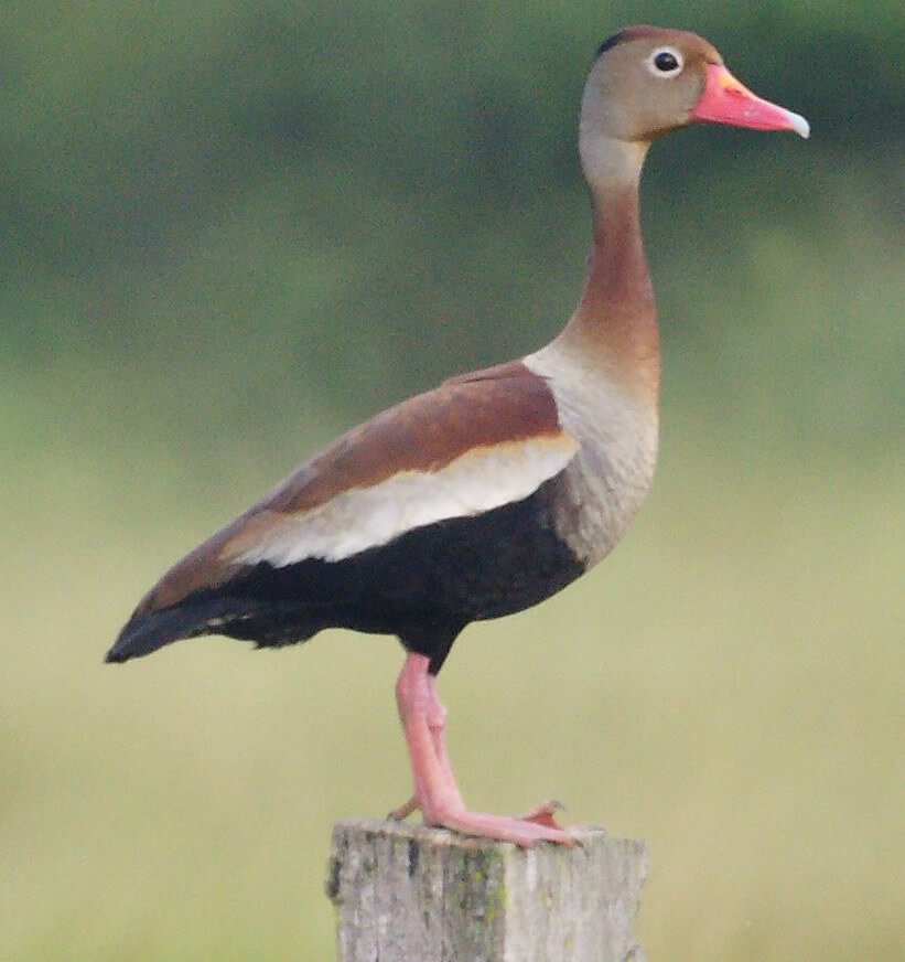 The Black-bellied Whistling Duck is a handsome, slender, long-necked duck with a bright pink to red bill, legs, and feet. Its body is mostly chestnut, with a grey head and (wait for it) black belly. These are dabbling ducks that love to also eat grain. They gather in noisy flocks and whistle! Unlike most ducks, they perch and nest in trees. Their usual range is Florida, Texas, Louisiana, and Central America.