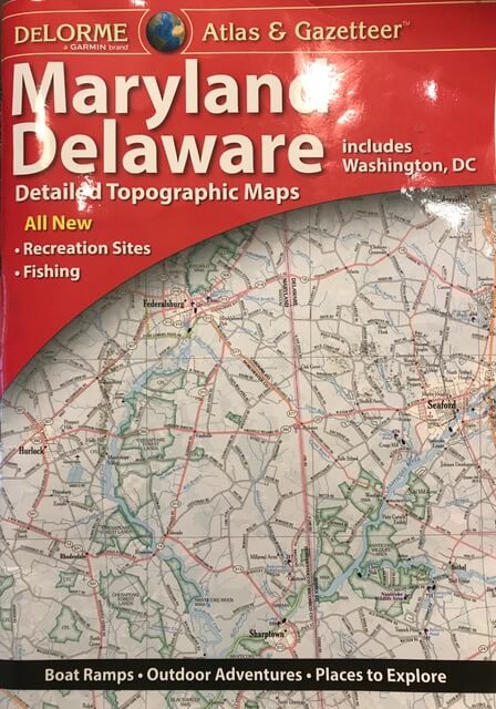 A DeLorme book of maps for Maryland and Delaware is essential! You really should have one in your car, anyway, and here’s a good reason to shell out $24.95. Advertised as “detailed topographical maps,” the book doesn’t disappoint; in addition to naming every road—dirt roads included—it locates and identifies bodies of water (small to large), railroads and power lines, public lands, campgrounds and boat ramps, i.e., every geographic and topographic detail.