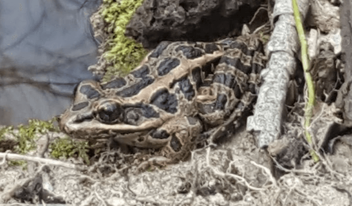 Pickerel frogs are also early to the spring party, announcing themselves with a low-pitched snore. Sometimes confused with the leopard frog, pickerel frogs are tan with two rows of dark brown rectangular spots running down their back. If you get a look at their legs, they have a distinctive yellow area on their inner thigh.