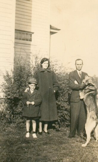 Jack with Mom, Dad, and friend at grandparents’ farm, about 1940